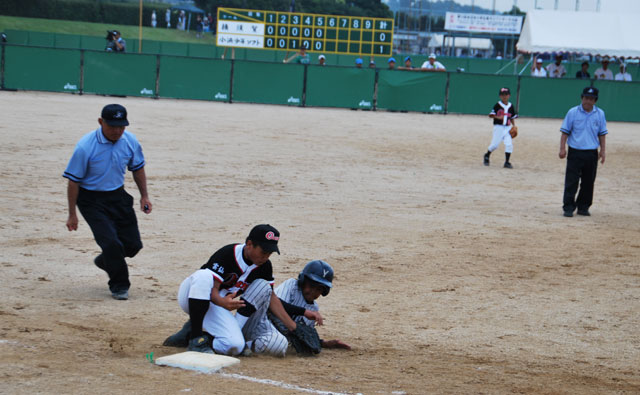アウト! 遊撃手:平山健太 走者:岡本 宝 |